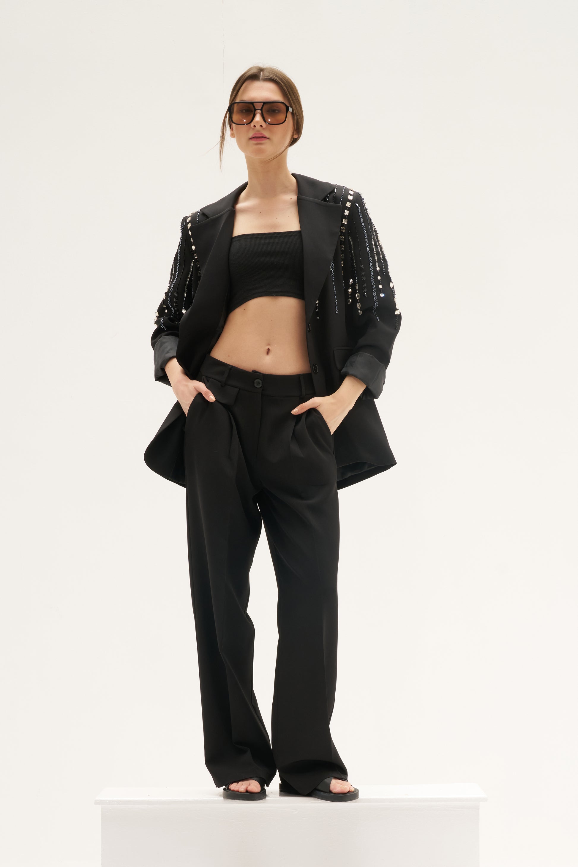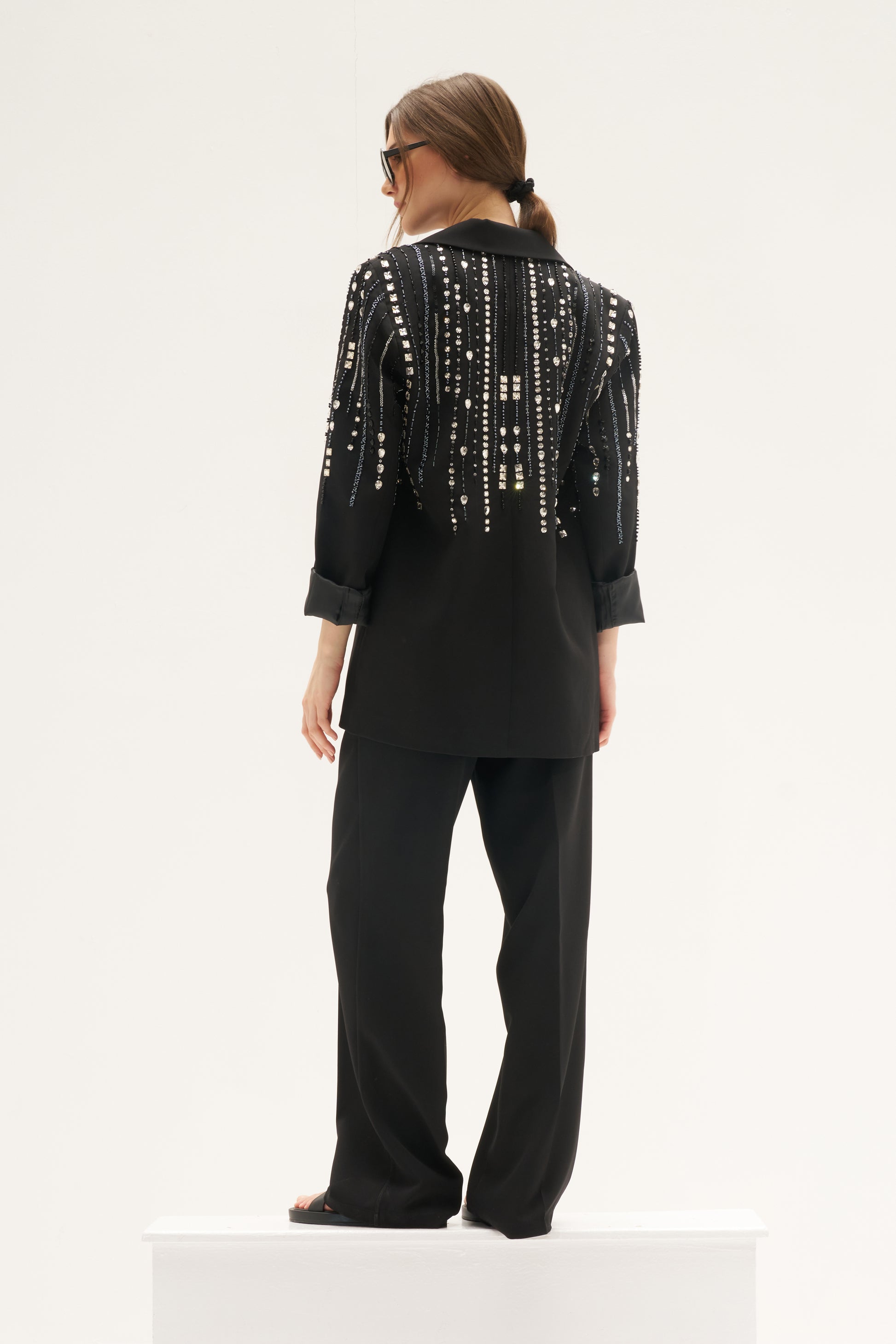 Introducing our Beaded Blazer, the perfect addition to your professional wardrobe. Made from high-quality materials, this blazer is part of our black suit collection, also available in off white. The intricate beaded detailing adds a touch of sophistication to your look. Elevate your style today with our Bling Blazer.