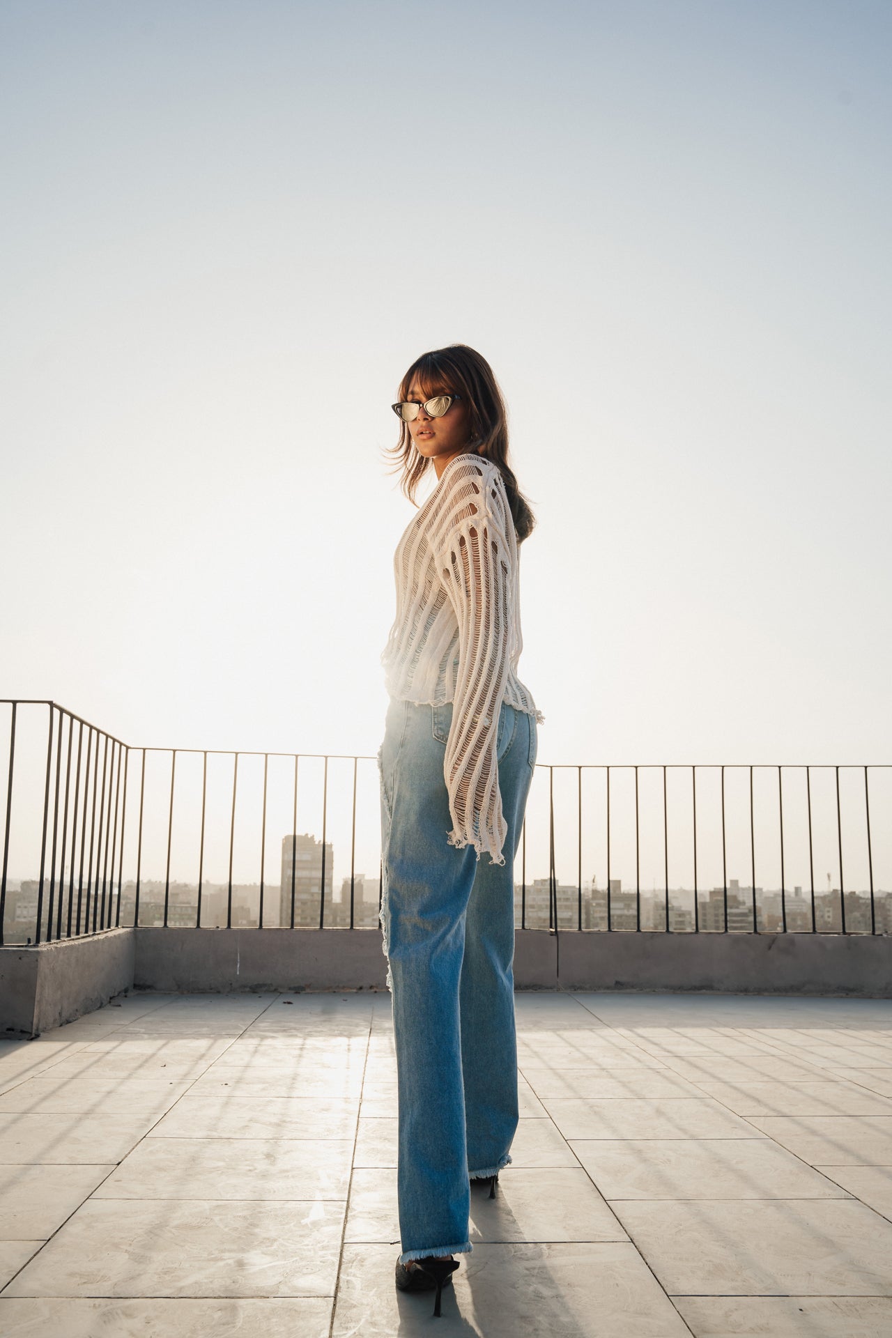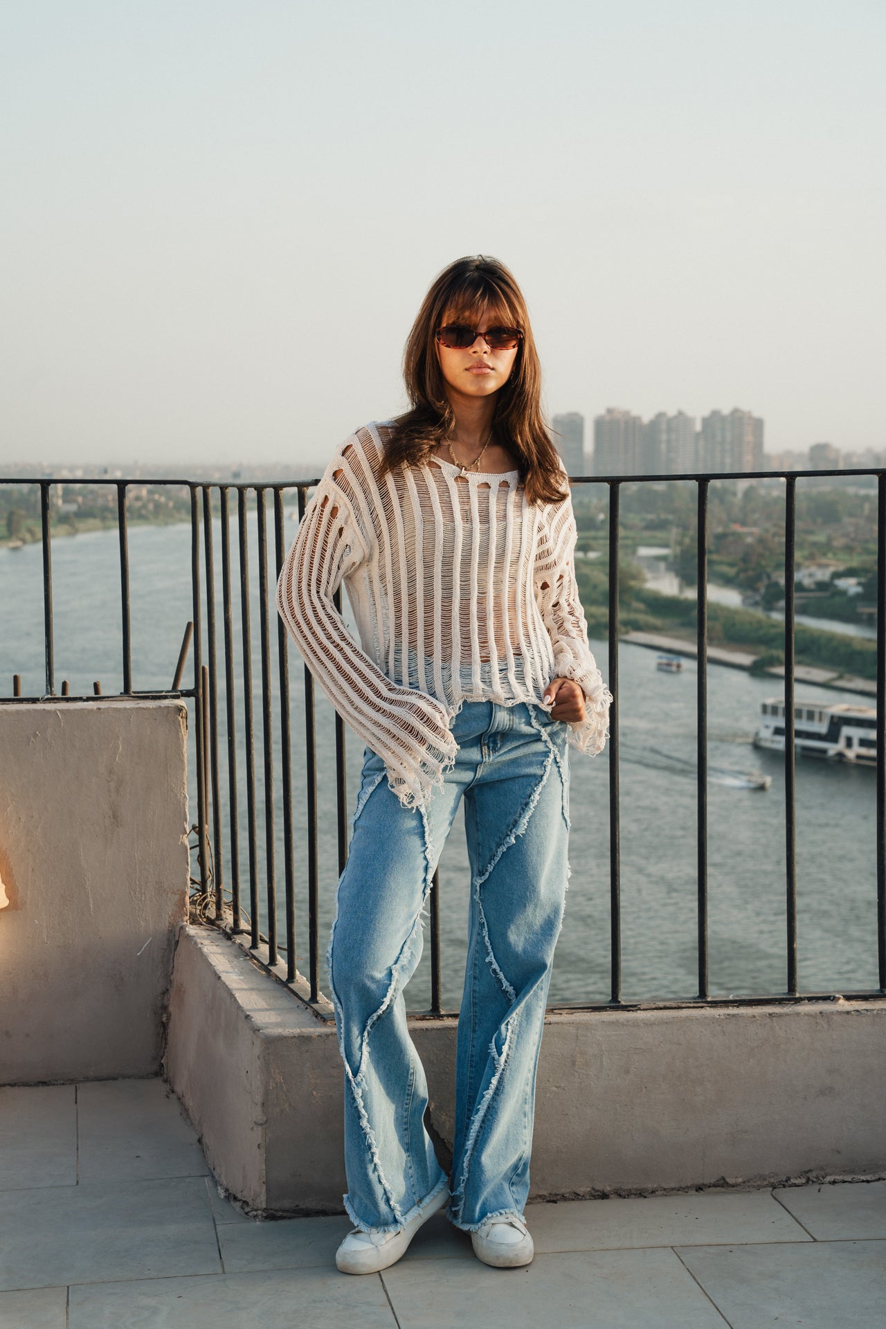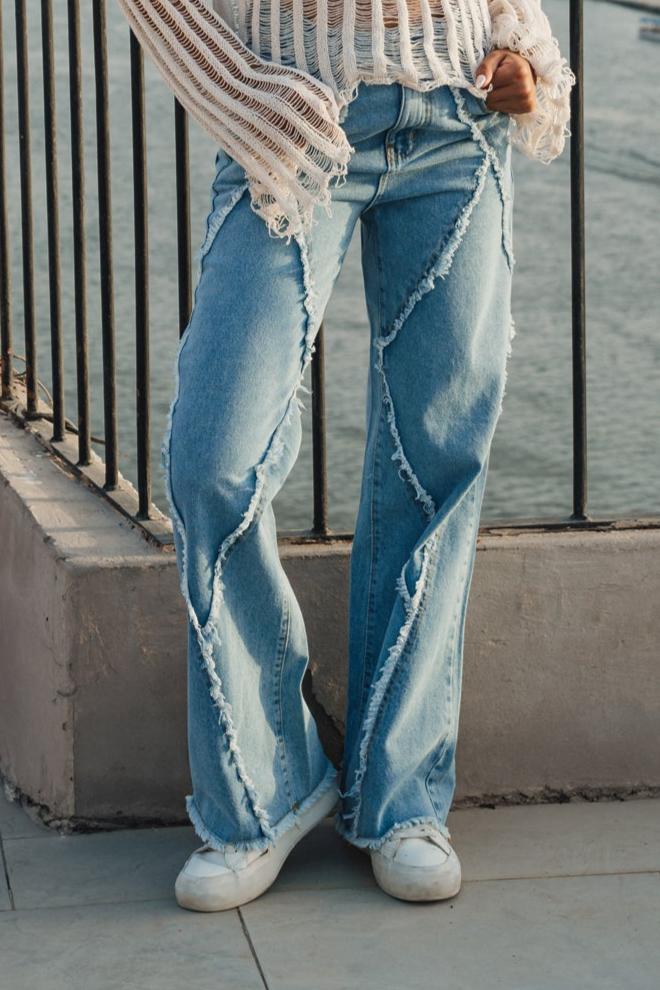wide-leg, light-washed jeans with a unique zigzag seam pattern and frayed detailing, these jeans bring a statement-making element to any outfit.