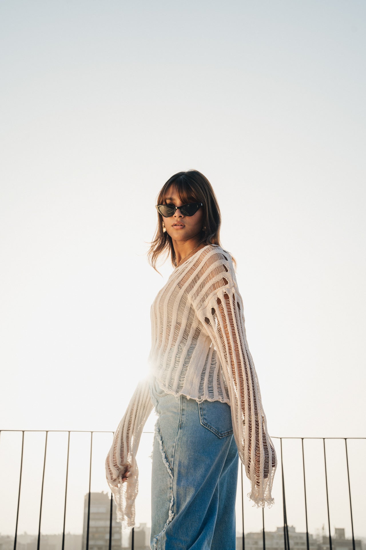 The outfit is completed with simple white sneakers and sleek sunglasses, perfect for an outdoor stroll or city adventure. Ideal for those who want to mix comfort and chic in one striking look.