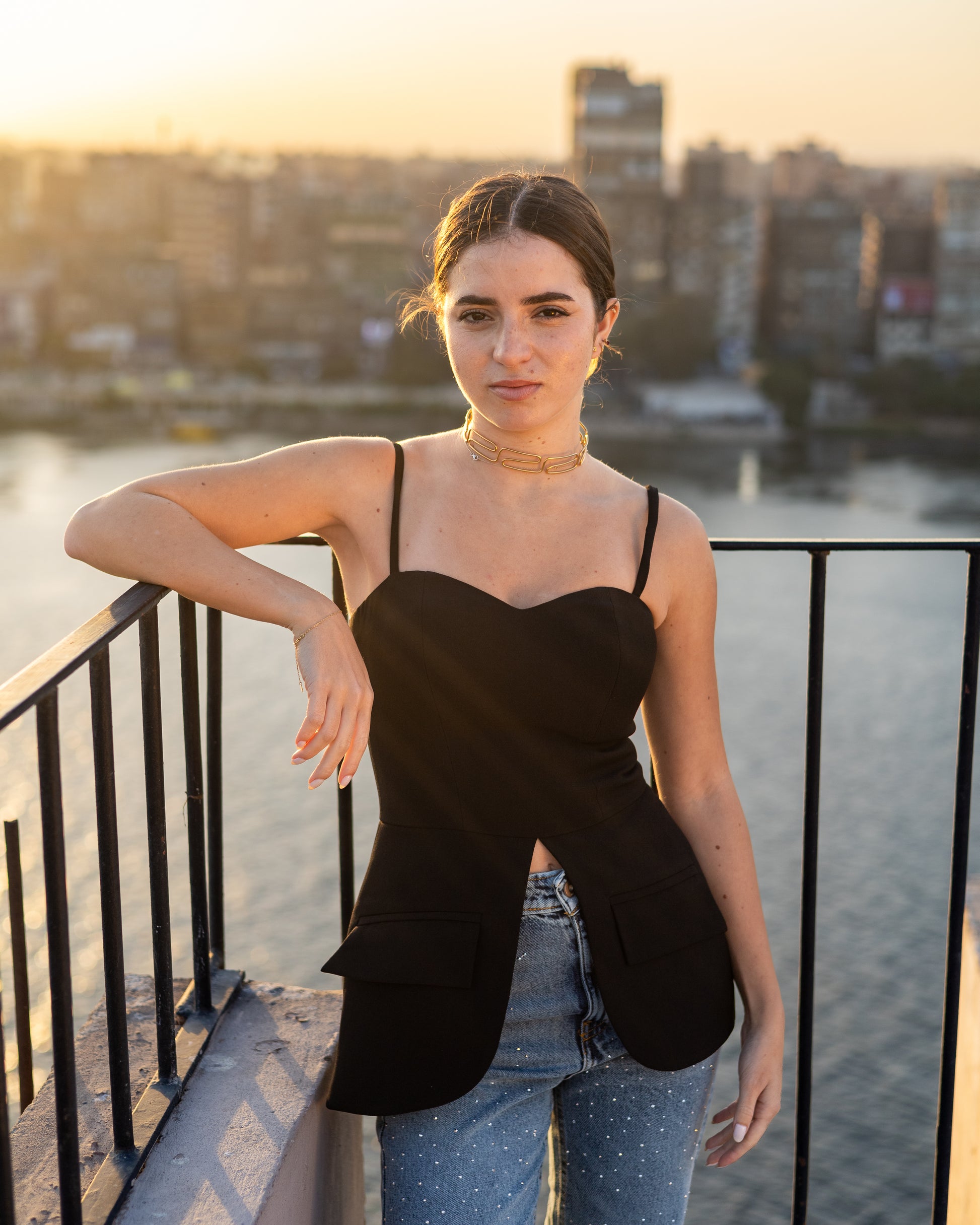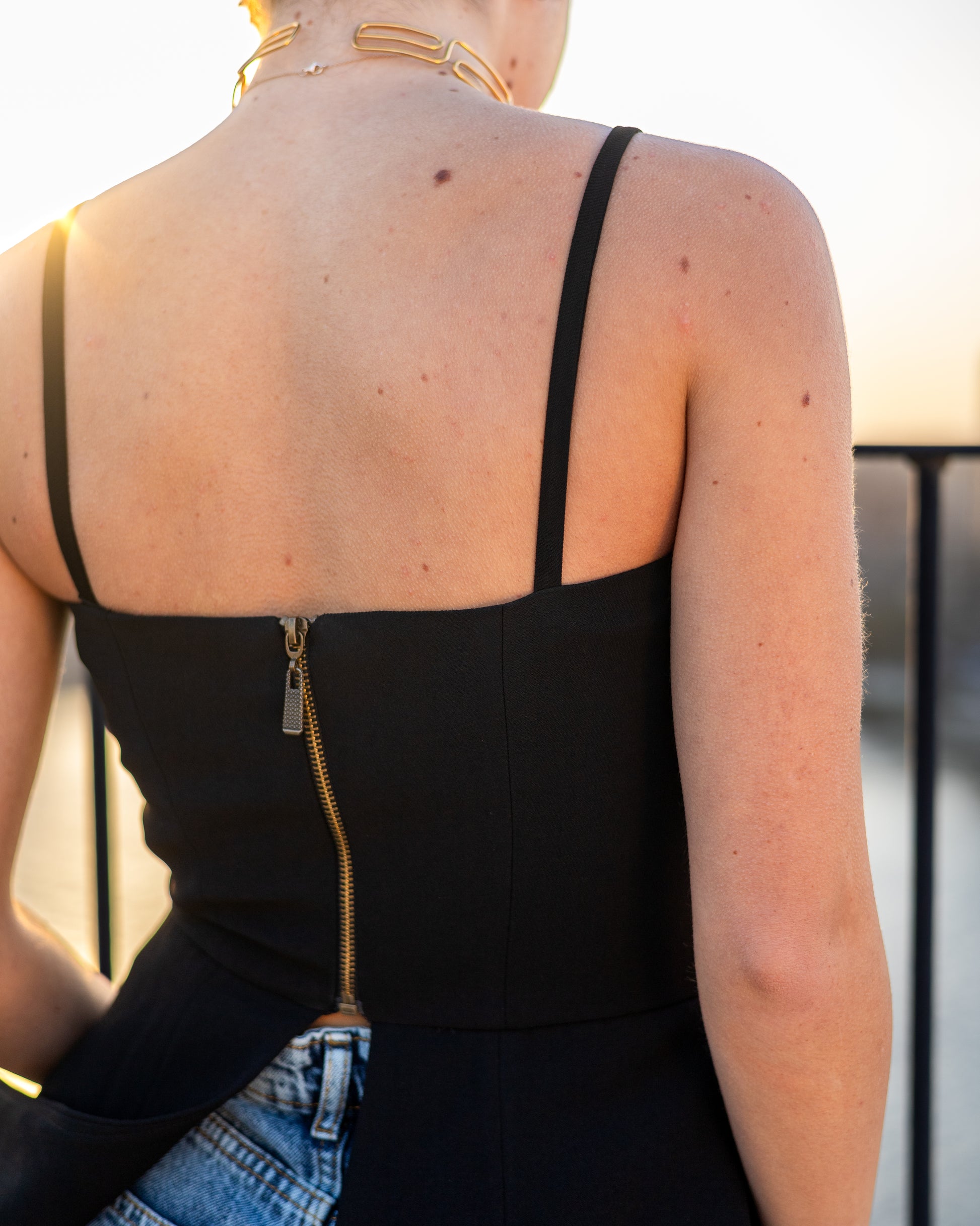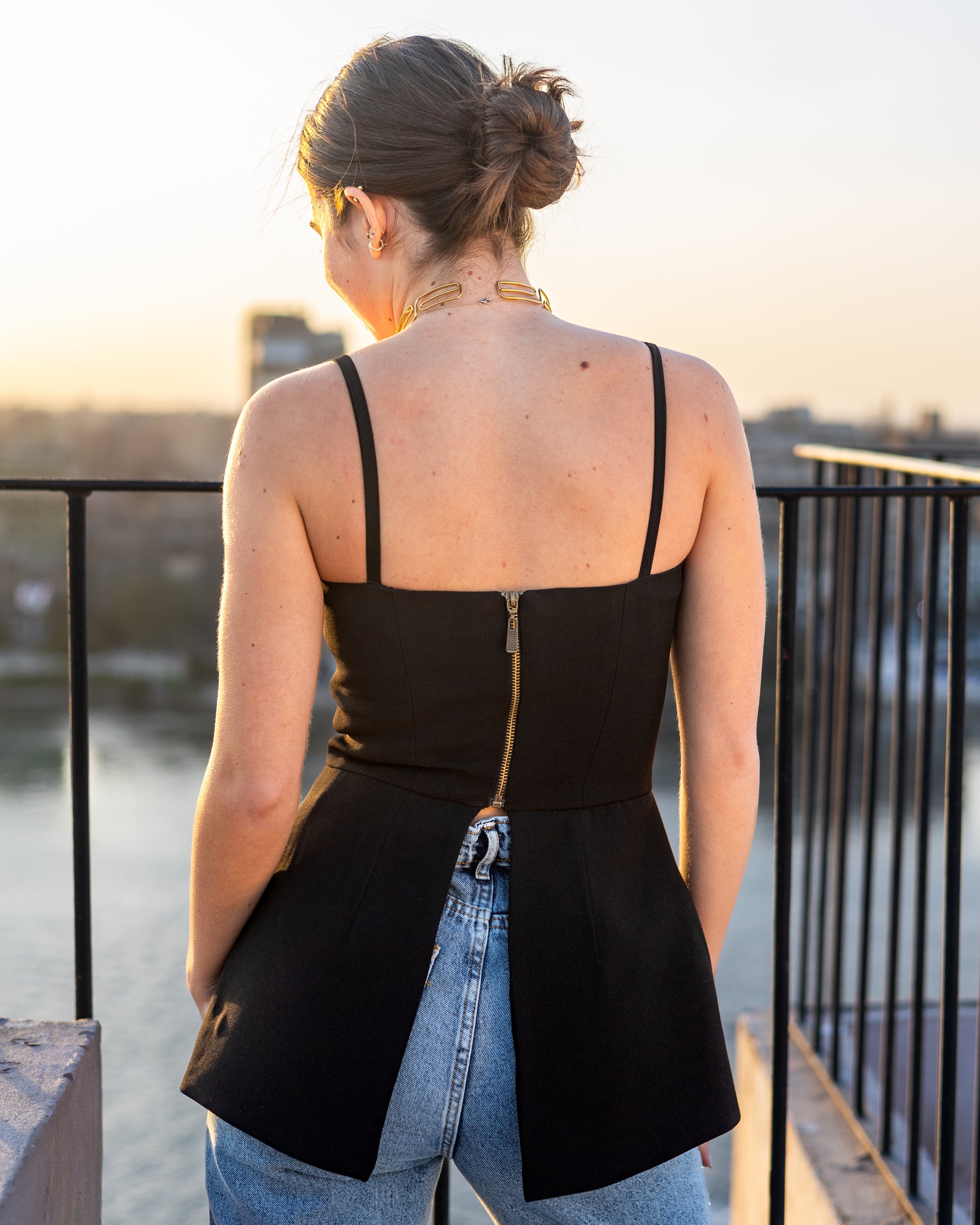 This is a chic and sophisticated black top featuring a sweetheart neckline with thin spaghetti straps. The tailored design highlights a fitted bodice, accentuated by a structured peplum hem with front slits and decorative flap pockets. Perfectly blending elegance and modernity, this versatile piece pairs effortlessly with jeans or formal trousers for day-to-night transitions.